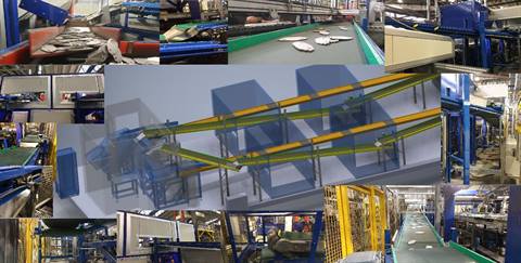 Serie di nastri trasportatori ad alta velocità per la reimmissione nel circuito delle pastiglie freno non prelevate dai robot.